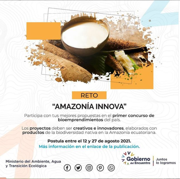 El Reto “AMAZONÍA INNOVA” es el primer concurso de innovación de bioemprendimientos en el país que busca promover las mejores ideas o propuestas, las más creativas e innovadoras que desarrolladas con productos de la biodiversidad nativa en la Amazonía ecuatoriana. La promoción de estas innovaciones también busca generar interés en nuevos mercados y consumidores alineados con la responsabilidad y el impacto de compra y consumo de forma sostenible.