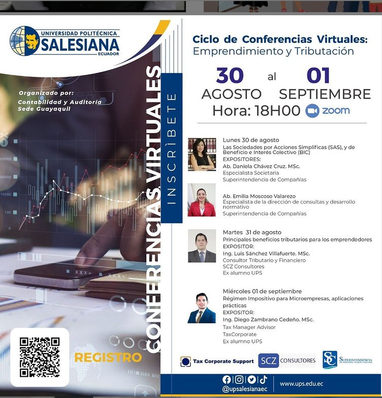 Especialistas Societarias de la Supercías participarán como ponentes en el ciclo de conferencias virtuales “Emprendimiento y Tributación” que organiza la carrera de Contabilidad y Auditoría de la UPS. La importancia de las conferencia radica en el emprendimiento y la innovación lo cual siempre tiene que ir ligado a la parte financiera y tributaria.