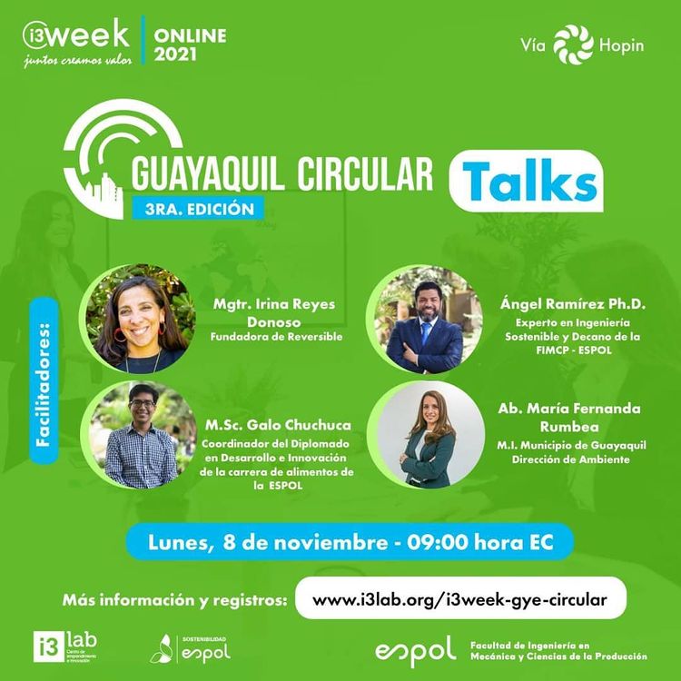 La 3° edición de #GuayaquilCircular♻️ será el evento que iniciará la Semana de Innovación, junto a expertos en torno a #EconomíaCircular. Durante la mañana del 8 de noviembre se llevará a cabo la jornada de Talks.