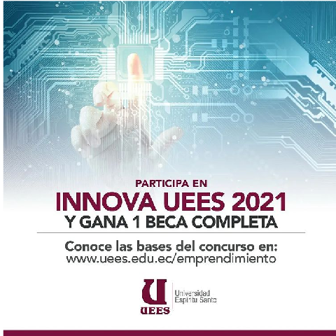 Te invitamos a participar del INNOVA UEES 2021 en el cual reconoceremos y premiaremos el esfuerzo de un estudiante de bachillerato, otorgando al ganador una BECA COMPLETA para sus estudios. “Innovar es utilizar el conocimiento, y generarlo si es necesario, para crear productos, servicios o procesos, que son nuevos para la empresa, o mejorar los ya existentes, consiguiendo con ello tener éxito en el mercado” (Manual de Oslo 1997).