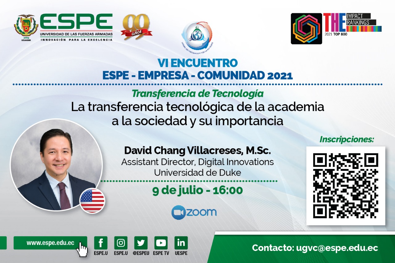 Webinar de Transferencia de Tecnología Tema: La transferencia tecnológica de la academia a la sociedad y su importancia. Expositor: David Chang Villacreses, M.Sc. Assistant Director, Digital Innovations - Duke University.