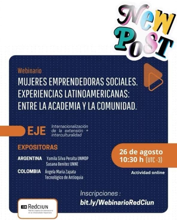El Webnario abordará el eje de internacionalización de la extensión y la interculturalidad para las mujeres emprendedoras sociales de Latinoamerica. Teniendo como expositoras las profesoras Yamila Silva Peralta de la UNMDP, Susana Benitez de la UNNE y Ângela Maria Zapata del Tecnológico de Antioquia.