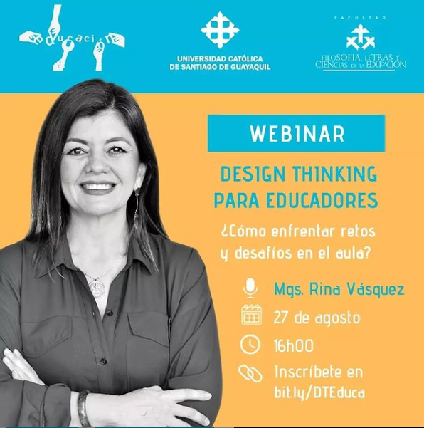 Rina Vásquez Guerrero, magister en innovaciones tecnológicas, nos mostrará la aplicación de los pasos de Desing Thinking como una estrategia para resolver retos y desafíos áulicos.