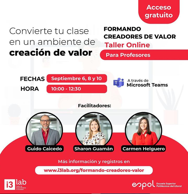 En este taller se abordarán las definiciones, pilares, referentes y ejemplos prácticos respecto a la Creación de Valor en un curso, independiente de la carrera a la que pertenece. Este taller es importante para ayudar a aterrizar la Creación de Valor en la práctica curricular, que consta como una de las competencias interdisciplinarias definidas en el Modelo Educativo de la ESPOL, recientemente aprobado. Se abordarán ejemplos de actividades adecuadas para formar en Creación de Valor y también de cómo integrar la rúbrica del resultado de aprendizaje relacionado a esta competencia a la evaluación de la materia.