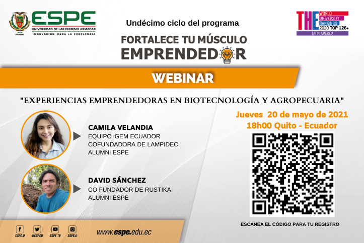 EXPERIENCIAS EMPRENDEDORAS EN BIOTECNOLOGÍA Y AGROPECUARIA Expositores: - Ing. Camila Velandia / Grupo iGEM Ecuador, líder del proyecto LAMPIDEC - Biocontrol preventivo de enfermedades en Bananeras y Plataneras del Ecuador - Ing. David Sánchez / Cofundador de Rustika Agricultura Regenerativa, agroecología y consumo responsable.