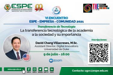 Webinar de Transferencia de Tecnología Tema: La transferencia tecnológica de la academia a la sociedad y su importancia. Expositor: David Chang Villacreses, M.Sc. Assistant Director, Digital Innovations - Duke University.