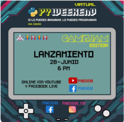 No te pierdas el lanzamiento del evento PyWeekend 8ava edición. Este Lunes 28 de Junio a las 18:00, a través de Facebook y Youtube. Síguenos en nuestras redes sociales para que te enteres de las últimas noticias del evento. Facebook: PyWeekend -Si lo puedes imaginar, lo puedes programar. Youtube: PYWEEKEND Instagram: @pywwekend_fdp Twitter: @pyweekend